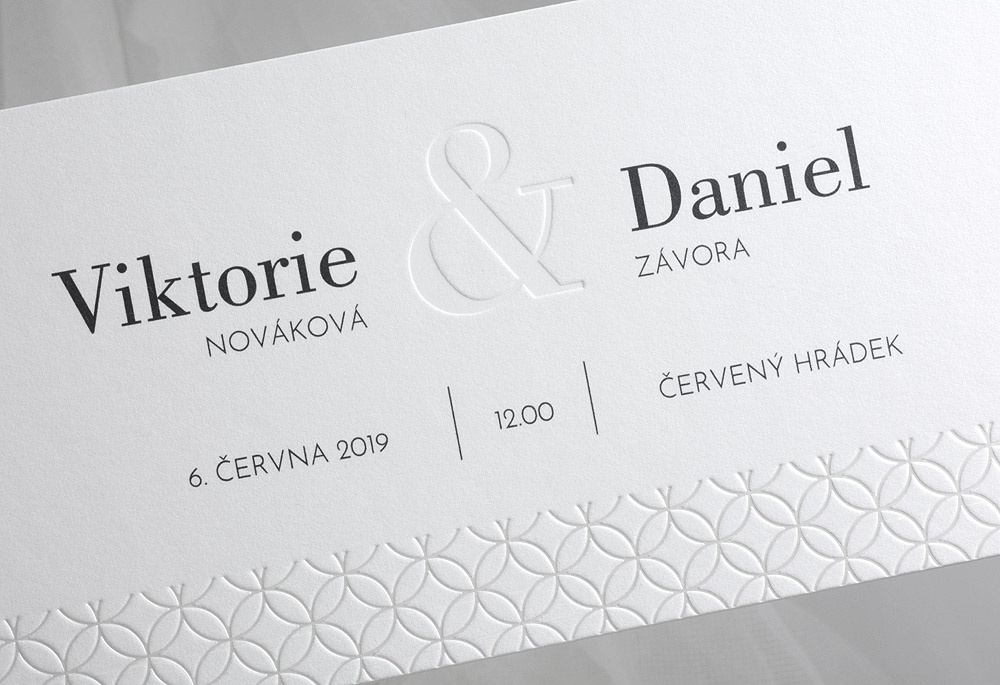 Svatební oznámení tištěné na vysoce silný bavlněný papír. Perleťový dekor v dolní části je zalisovaný do papíru. Znak & je pouze vylisovaný, není perleťový. Písma doporučujeme ponechat přesně tak, jak jsou na vzorovém oznámení. |